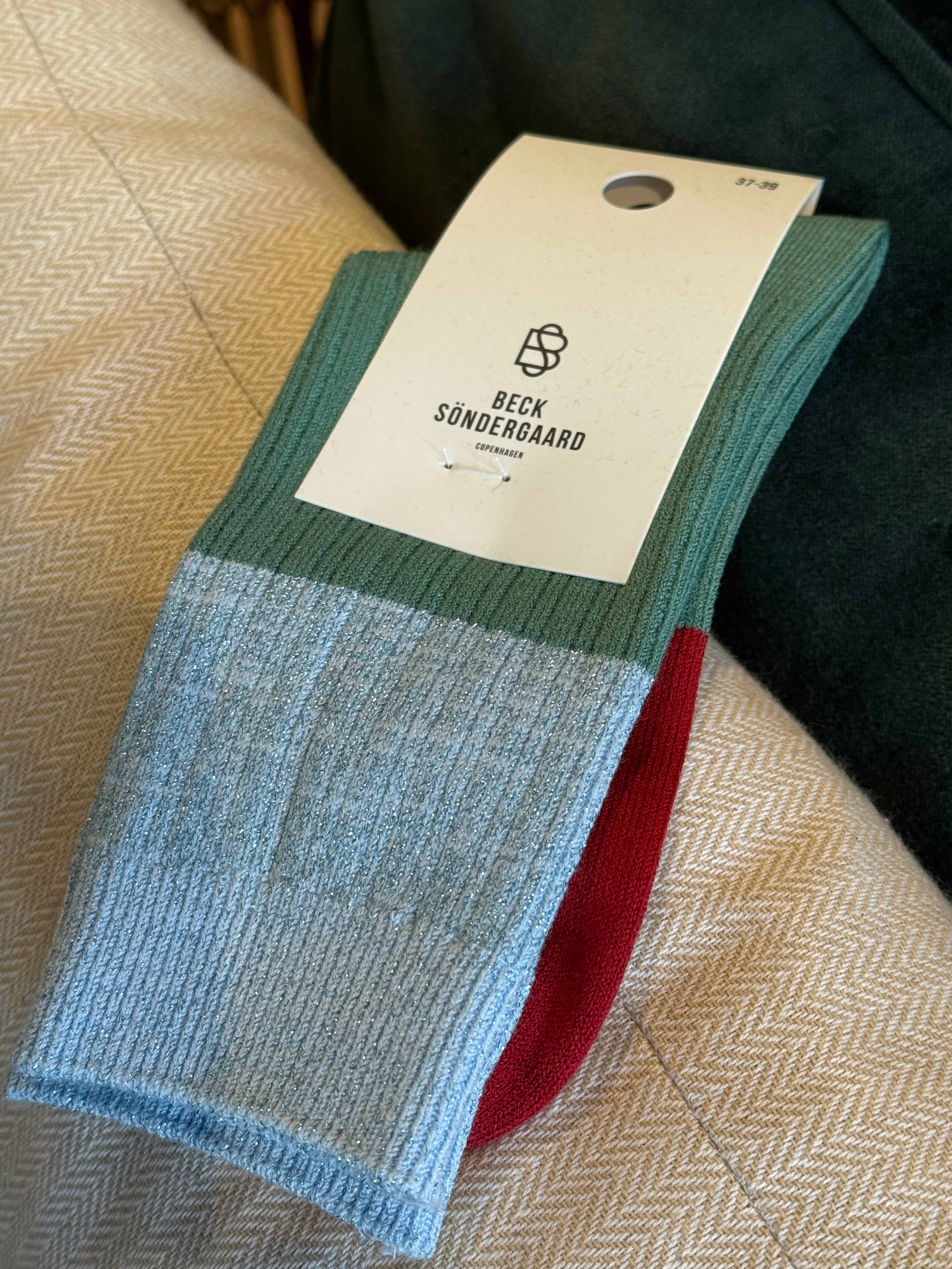 The Block Sock designed by Becksöndergaard is a stylish and festive sock made from 40% viscose, 34% polyester, 24% polyamide, and 2% elastane. The socks upper pale blue section of the socks has sparkles. Very festive.