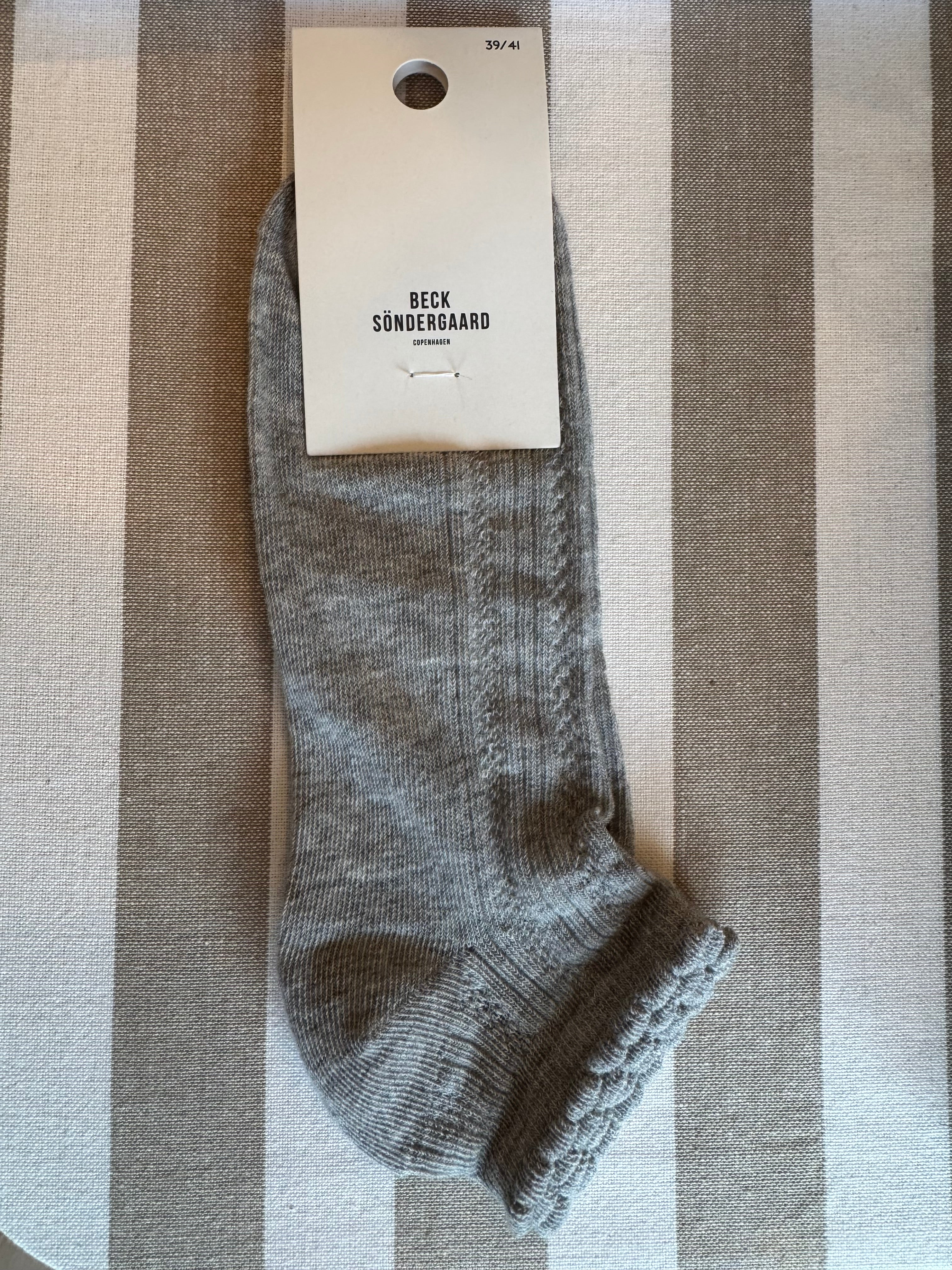 Crochia Cotta Short Sock from Becksöndergaard is an ankle-length sock made from 85% cotton, 10% polyamide, 4% polyester and 1% elastane. The sock features a delicate ruffle detail for a feminine look. Available in Cream and Grey.